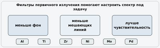 Материал фильтра и его толщина подбираются не по одному универсальному правилу, а под конкретный анод трубки и аналитическую задачу. Один режим может быть оптимален для переходных металлов, другой, для средней части спектра, третий, для тяжёлых элементов.